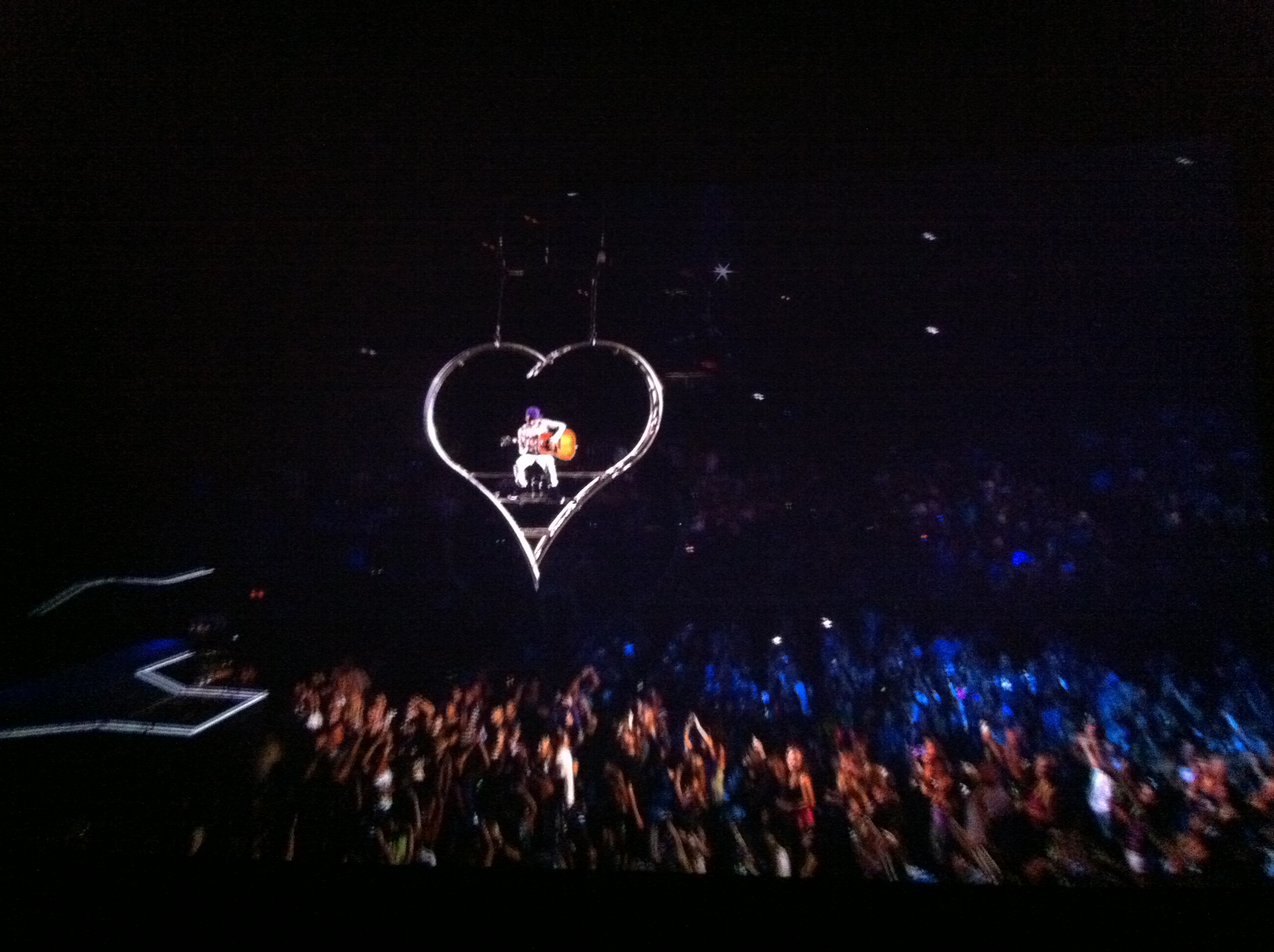 At one point Justin appears suspended over the crowd, sitting in a giant chrome heart and serenading the girls with an acoustic guitar. I am not making this up, see for yourself: