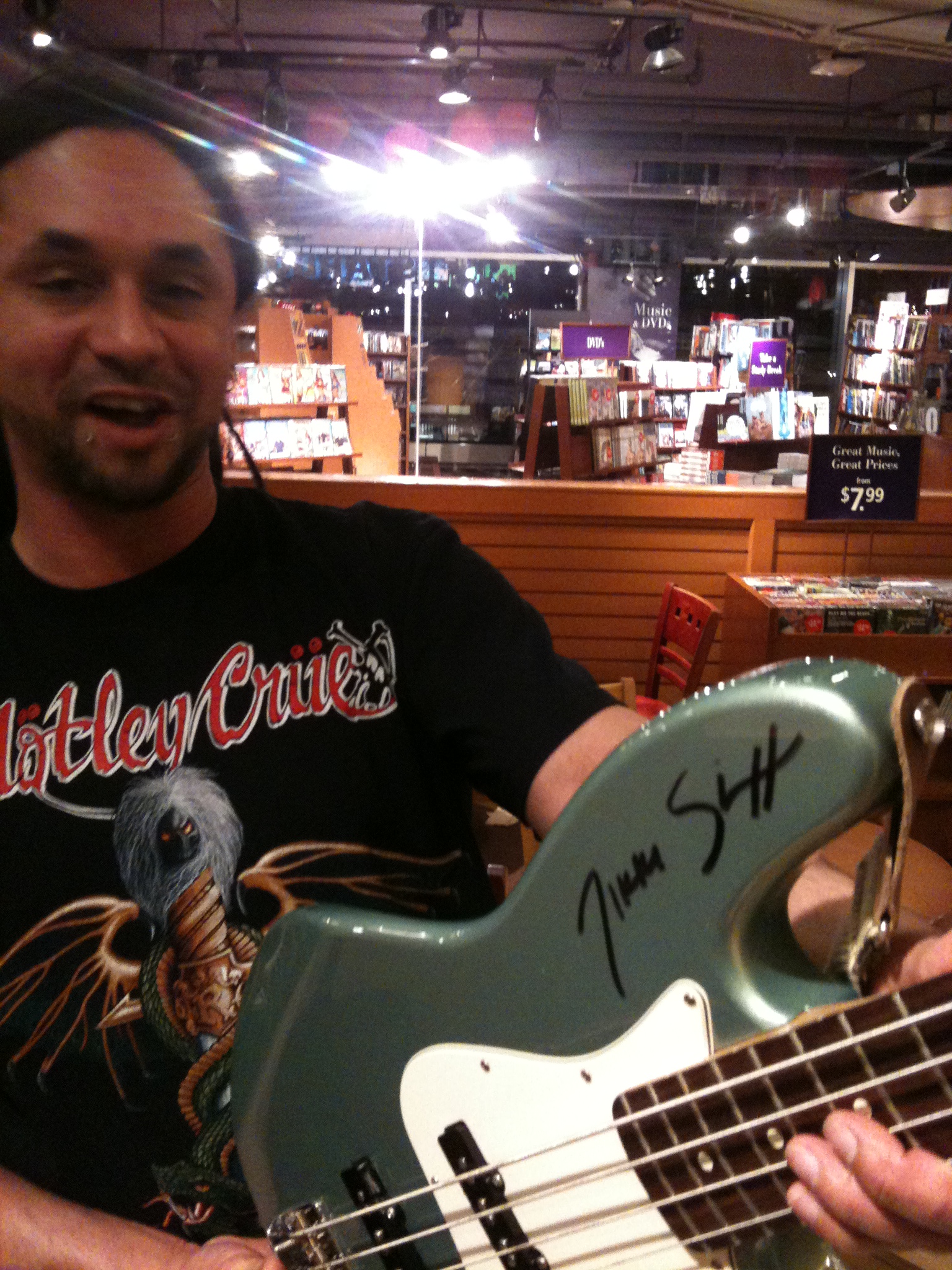 Thankfully he is a gregarious type and became fast friends with the girl in front of us in line and the couple behind us, Darnell and Jenn, who were awesome. Darnell is a bass player and had brought along his bass in hopes that Nikki would sign it. The bookstore staff were going around saying that he would only sign books and CDs, but we assured Darnell that a rad dude like Nikki would not turn away a fellow bass player.