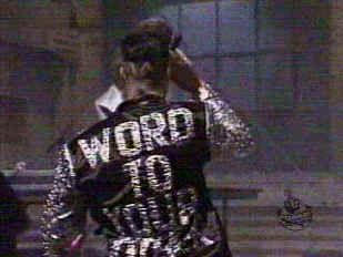 I know what you’re thinking — how did an oversight of such magnitude occur? The situation is nothing short of tragic. I mean, the song was released in 1990, so for 22 years I could have been reveling in the supreme awesomeness that is this video. And it’s not like I haven’t seen the cinematic gem Cool As Ice (which I will delve into further at a later date, as it obviously deserves it’s own post). Or the live performance of this song on Saturday Night Live, during which Vanilla Ice sported a truly magnificent jacket with ‘WORD TO YOUR MOTHA’ spelled out in diamond studs on the back — possibly the best piece of clothing worn by anyone, anywhere, in the history of time. Sadly, this is the only picture I could find of it: