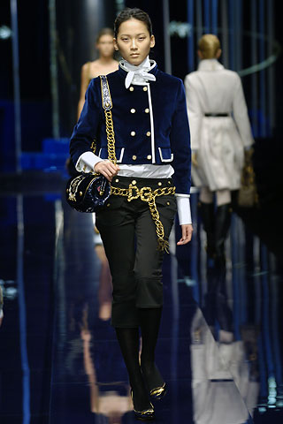 Sidenote: Almost every single piece in D&G’s Fall 2006 runway show was so insanely amazing that the whole thing makes me want to sob with joy. They basically had their models dressed up as Napoleon and Josephine, and the attention to detail is stellar, from the high collars to the crested buttons to the braided gold rope trim. If you’re ever feeling down, check out the slideshow on Style.com – even if you can’t afford them (who can?), it’ll make you feel better just knowing that such beautiful clothes exist.